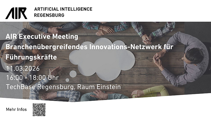 Wir laden Sie am 11. März 2026 herzlich ein zum exklusiven AIR Executive Meeting – dem halbjährlichen Treffpunkt für Entscheidungsträger und Visionäre, die die KI-Zukunft der Region Regensburg aktiv gestalten.