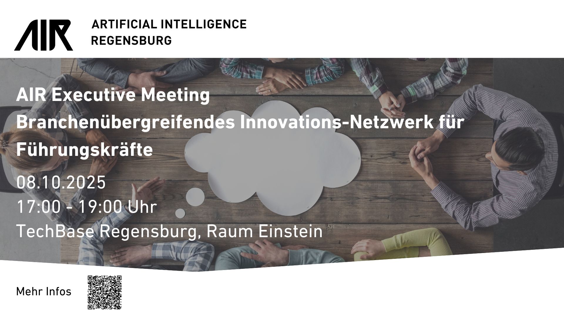 Wir laden Sie am 08. Oktober herzlich ein zum exklusiven AIR Executive Meeting – dem halbjährlichen Treffpunkt für Entscheidungsträger und Visionäre, die die KI-Zukunft der Region Regensburg aktiv gestalten.