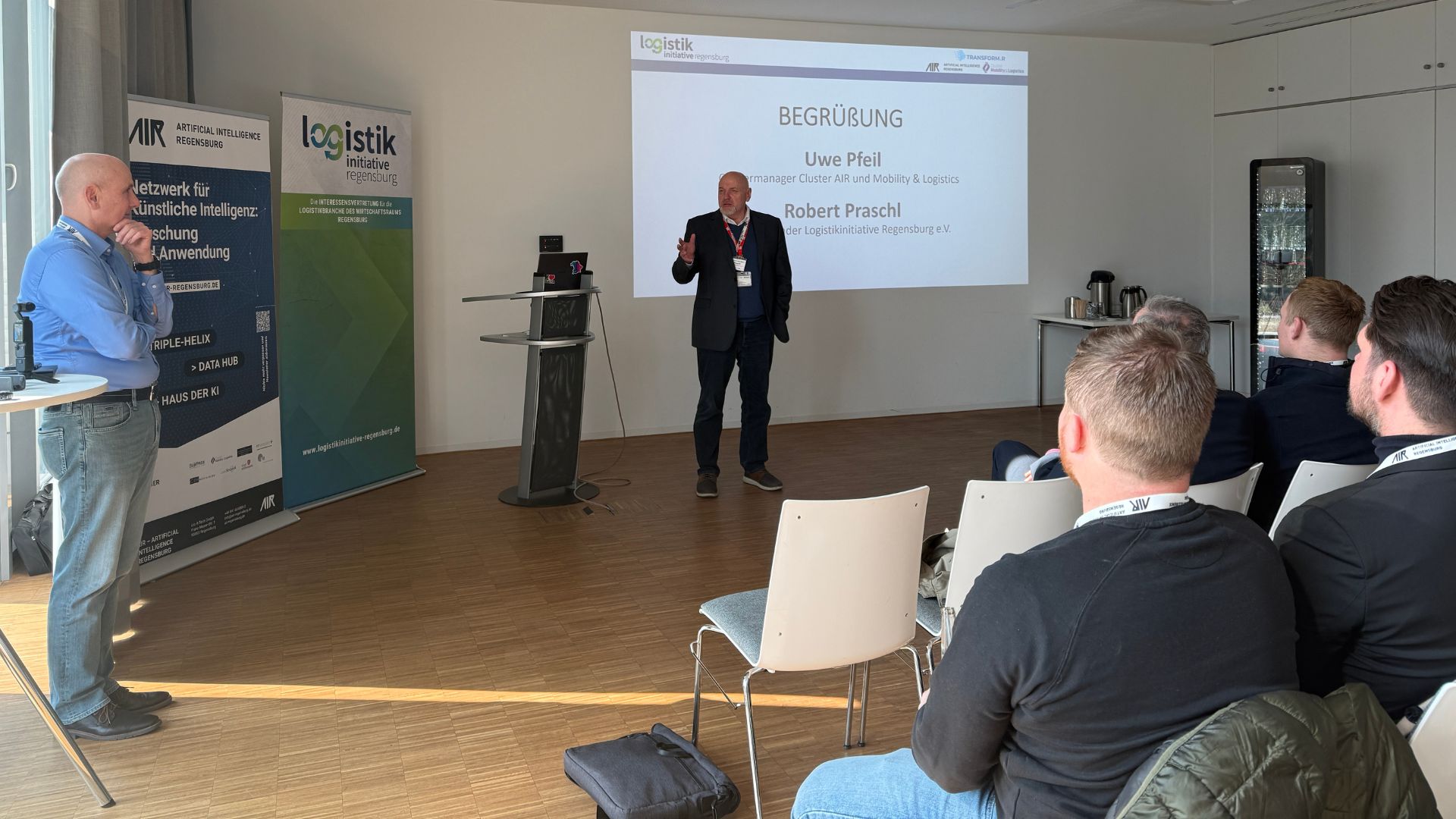 Gemeinsam organisiert von der Logistikinitiative Regensburg sowie den Clustern AIR Artificial Intelligence Regensburg und Mobility & Logistics im Rahmen des Projekts transform.r, stand insbesondere der konkrete Nutzen im Unternehmensalltag im Mittelpunkt. In ihrer Begrüßung betonten der 1. Vorsitzende der Logistikinitiative Regensburg e.V. Robert Praschl und Uwe Pfeil, Clustermanager AIR und Mobility & Logistics, die Chance sich in der Region gemeinsam auszutauschen und voneinander zu lernen.