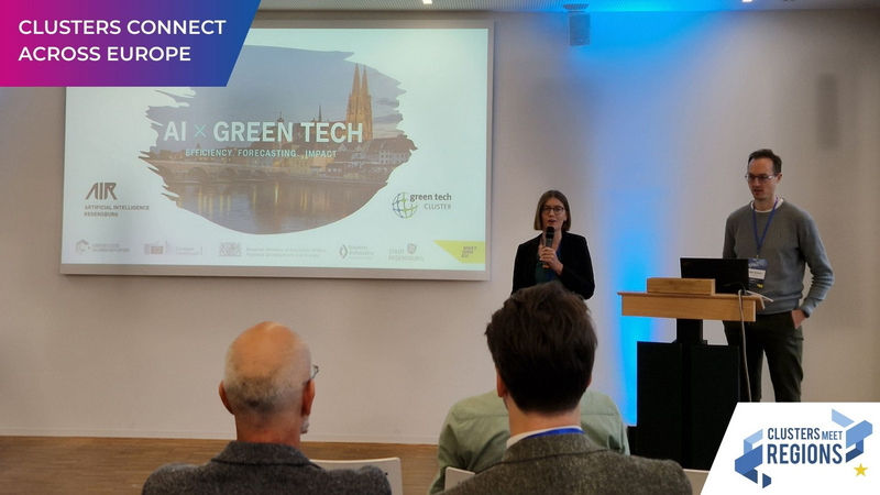 During Day 2 of Clusters Meet Regions Regensburg, Cross-Session III focused on the intersection of green technologies and artificial intelligence and highlighted how coordinated cluster cooperation can accelerate sustainable innovation in the region. The session brought together Katja Eichinger (AIR Artificial Intelligence Regensburg), Nicole Höß (OTH Regensburg), Quirin Schneider (Pendura), and Oliver Kotzulla (Green Tech Cluster Regensburg / Energieagentur Regensburg) to present current developments and practical examples from the regional ecosystem.