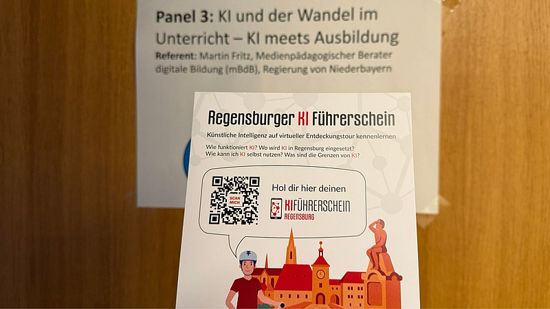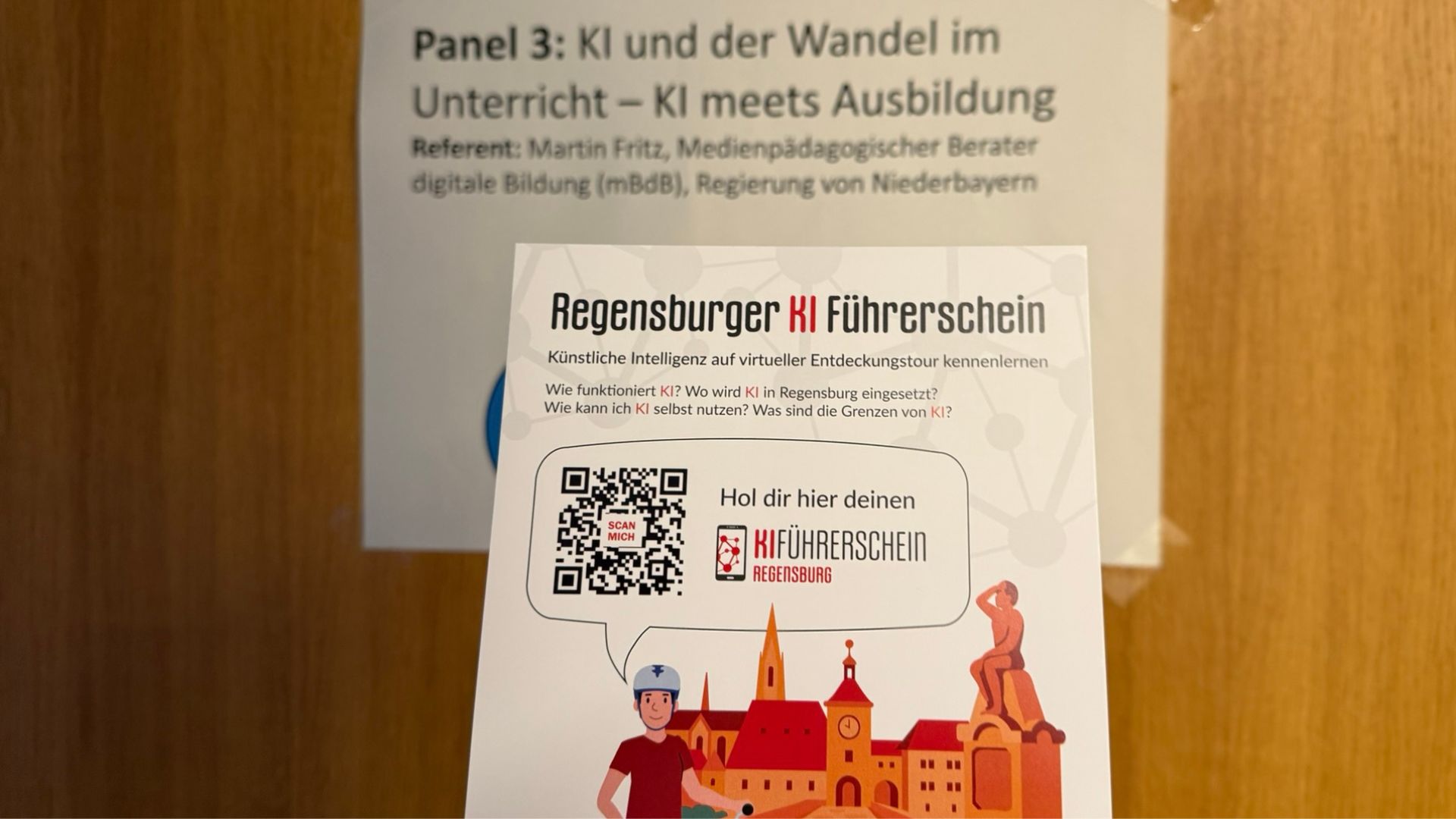 Hier durfte natürlich der Regensburger KI-Führerschein nicht fehlen! AIR-Projektmanagerin Katja Eichinger durfte das innovative Lernangebot zu Beginn des Panels „KI und der Wandel im Unterricht – KI meets Ausbildung“ den teilnehmenden Lehrkräften kurz vorstellen. Das Panel wurde von Martin Fritz, medienpädagogischer Berater digitale Bildung, Regierung von Niederbayern, gestaltet. Ein wichtiges Takeaway: KI-Kompetenz ist unverzichtbar. Ein Verbot von KI im Unterricht löst nichts – wir müssen Lehrende und Lernende befähigen, die Zukunftstechnologie verantwortungsvoll zu nutzen.